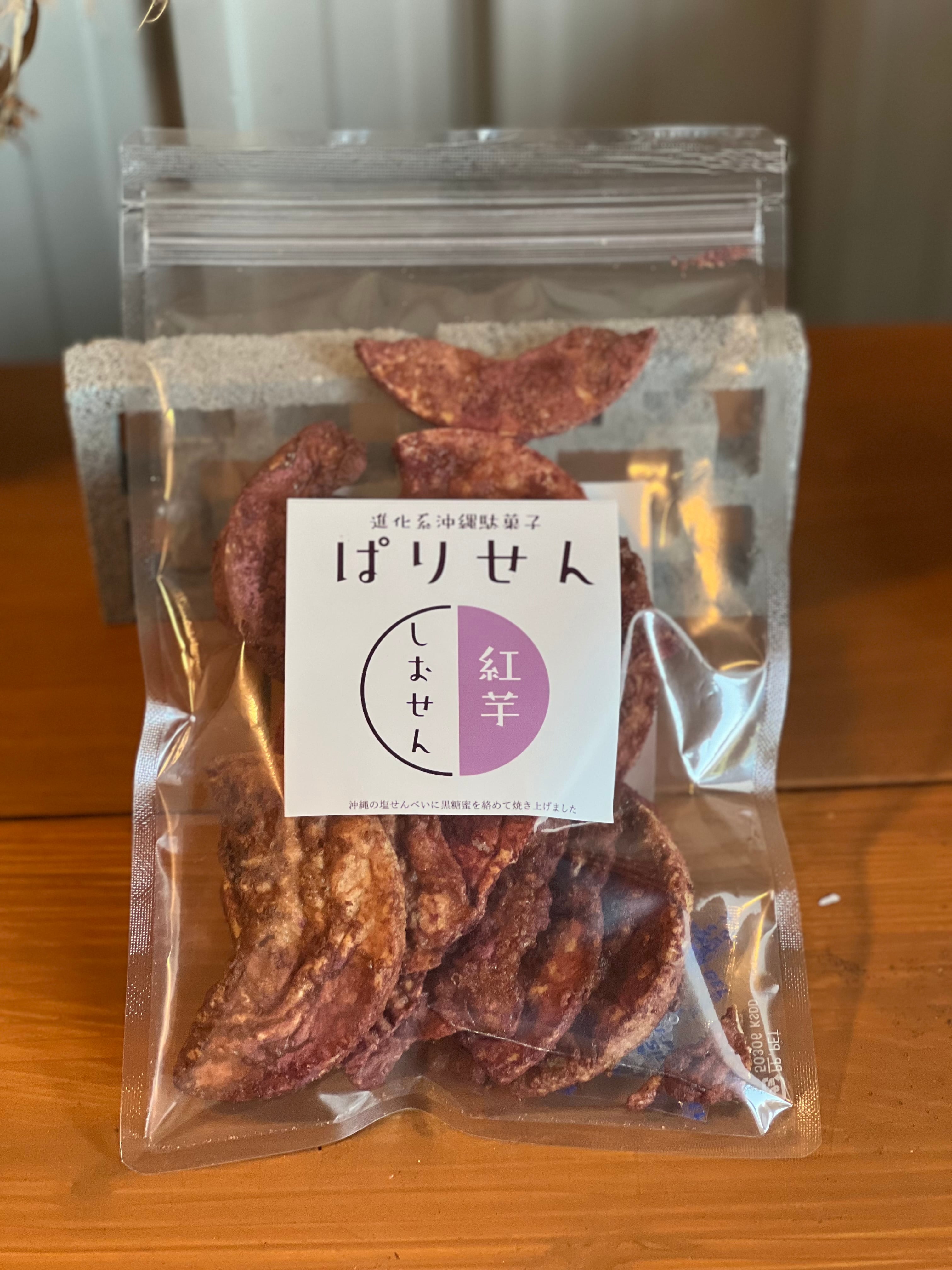 【紅芋】塩せんべい(小麦粉(国内製造)、コーンスターチ(遺伝子組み換えではない)、黒糖(沖縄産)、原料糖、紅芋(沖縄県産)、ココナッツ、塩(沖縄産)